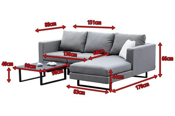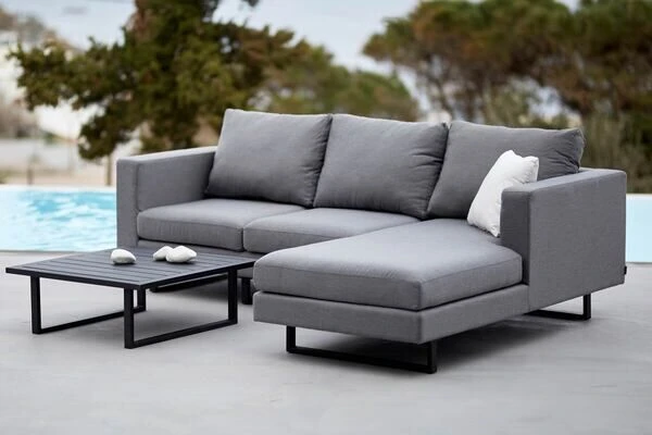 Diese komplette Premium-Loungegruppe von OUTFLEXX® aus einem 2-Sitzer Sofa mit der Armlehne rechts (ca. 151 x 88 x 66 cm), einer Chaiselongue (ca. 170 x 83 x 66 cm) und einem anthrazitfarbenen Kaffeetisch (ca. 90 x 90 x 40 cm) bietet bis zu vier Personen bequem Platz. Der Oberstoff in der Sunbrellafarbe flanelle unterstreicht den einzigartigen Charakter der Möbel. Für das Gestell der Möbel und des Tisches wird robustes, pulverbeschichtetes Aluminium verwendet, welches mit der Schaumstoff-Sunbrella Kombination eine solide Sitzmöglichkeit bietet.