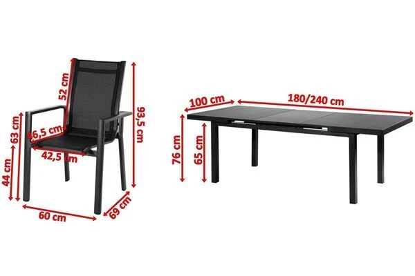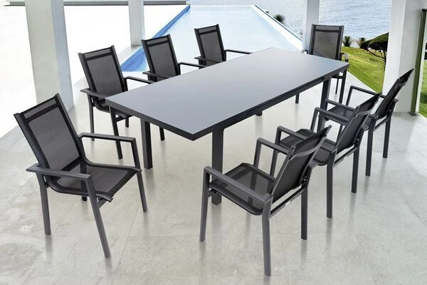 OUTFLEXX® Premium Esstischgarnitur, OUTFLEXX® anthrazit matt, Alu/Textilene, Premium Ausziehtisch 180/240x100cm, 8 Stapelsessel