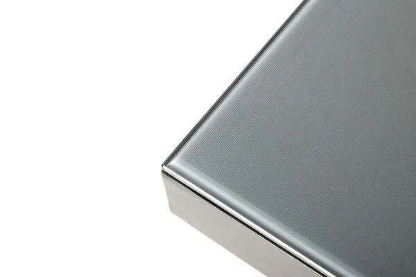 Seine besondere Optik verdankt er der Kombination aus der ca. 5 cm dicken Tischplatte aus Alu/Einscheibensicherheitsglas und dem matten anthrazitfarbenen Aluminiumgestell. Das ca. 5 mm dicke Sicherheitsglas überzeugt durch seine zahlreichen Vorteile und seine besondere Optik. Die geriffelte Tischplattenoberfläche sorgt dafür, dass das einfallende Licht nicht reflektiert wird und so ein matter Effekt entsteht. Der graue Siebdruck auf der Unterseite der Glasplatte sorgt für die graue Optik der Tischplatte.