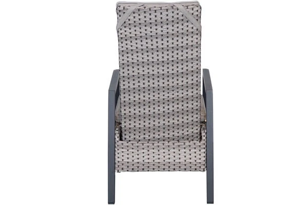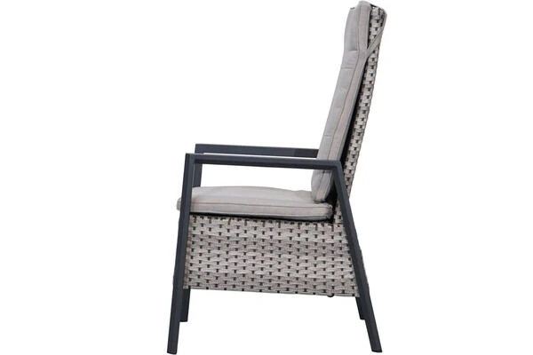Das Untergestell der Sessel besteht aus pulverbeschichtetem Aluminium, diese macht es nicht nur stabil, sondern sorgt auch dafür, dass sie sich aufgrund des relativ geringen Gewichts ganz leicht hin und her stellen lassen. Das Aluminiumgestell wird mit Polyrattangeflecht bespannt. Der flach-halbrunde Geflechtmix ist in der Farbe natur-anthrazit gehalten und schafft so helle und freundliche Momente in allen möglichen Terrasseneinrichtungen. Gemütliche Sitz- und Rückenpolster mit Olefinbezug sorgen für höchsten Sitzkomfort. Farblich sind die graufarbenen Polster mit Quernähten perfekt auf das Geflecht abgestimmt.