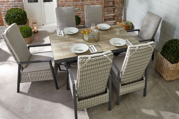 Diese gemütliche Esstischgruppe bietet bequem bis zu 6 Personen Platz. Das Set besteht aus einem Auszugs-Dining-Tisch und sechs Diningsesseln. Hier können Sie bequem Ihr Mittag- oder Abendessen zu sich nehmen – und danach mit einem guten Buch in der Sonne entspannen. Hierzu brauchen Sie einfach nur Platz zu nehmen und eine bequeme Sitzposition einstellen. Dies gelingt kinderleicht dank der integrierten Gasdruckfeder – die Rückenlehne kann mit einem kleinen Knopf an der Seite stufenlos verstellt werden.