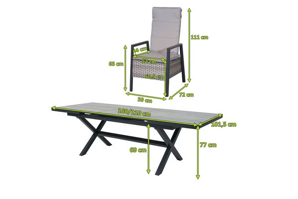 Die Sessel haben ein Gesamtmaß von jeweils ca. 59 x 72 x 111 cm und bei einer Belastbarkeit von ca. 110 kg ist er sehr robust. Die Sitzfläche ist ca. 44 cm tief, die Sitzhöhe mit Kissen liegt bei ca. 50,5 cm. Die Armlehnen mit einer Höhe von ca. 65 cm sorgen für besonderen Sitzkomfort. Der in diesem Set enthaltene Esstisch bietet mit seinen Grundmaßen von ca. 160 x 101,5 x 77 cm bereits eine ausladende Abstellfläche – genügend Platz für Kaffee und Kuchen, oder aber auch für Snacks und Getränke. Durch die Ausziehfunktion kann dieser Tisch auch bei spontanem Besuch glänzen und besitzt eine Ausziehlänge von ca. 210 cm. Die Tischplatte besteht aus Keramikfliesen, welche besonders pflegeleicht und dazu stoß-, schlag- und schnittbeständig ist. Dazu weist der Ausziehtisch eine Unterschubhöhe von ca. 69 cm vor. Die Sessel können mit einer Armlehnenhöhe von ca. 65 cm problemlos unter den Tisch geschoben werden.