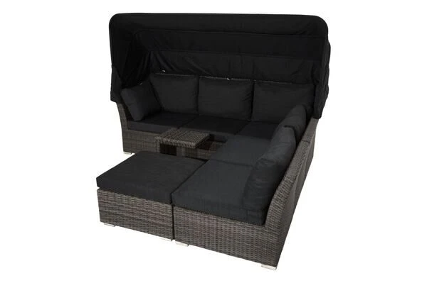 Diese gemütliche Loungegruppe bietet bequem bis zu sechs Personen Platz. Hier können Sie gemütlich in der Sonne liegen oder aber auch ganz bequem einen kleinen Snack servieren. Das Set besteht aus einem 3-Sitzer Sofa mit Maßen von ca. 230 x 81 x 85 cm, zwei Mittelelementen (ca. 68 x 81 x 70 cm), einem Hocker (ca. 68 x 68 x 32 cm) und einem praktischen Beistelltisch von ca. 31 x 42 x 49 cm. Die Lounge ist ein wahrer Verwandlungskünstler: Ob als Einzelteile gestellt, zur Ecklounge oder sogar als Loungebett – hier sind Ihrer Fantasie keine Grenzen gesetzt. Der Beistelltisch lässt sich sogar über die Sitzflächen drüber schieben, so haben Sie eine integrierte Ablagefläche. Das Highlight dieser gemütlichen Sitzgruppe ist das im 3-Sitzer Sofa integrierte Sonnendach, welches ganz leicht hochgeklappt werden kann. So haben Sie Ihren Sonnenschutz bereits fest verbaut. Und für die Sonnenanbeter – das Dach lässt sich natürlich auch zurück klappen, so können Sie ganz entspannt in der Sonne liegen.