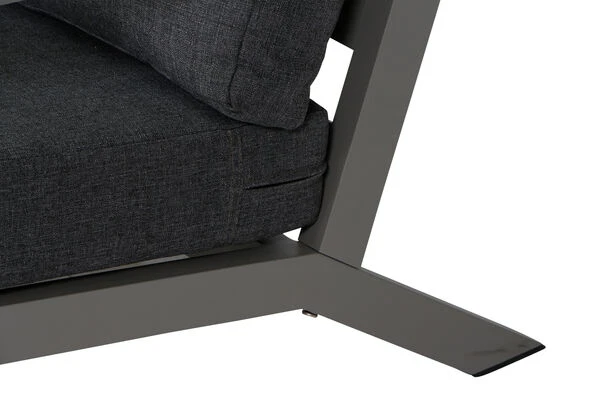 | Pulverbeschichtete Veredelung Das pulverbeschichtete Aluminiumgestell des Sessels ist rostfrei, korrosionsbeständig und hält daher üblichen Witterungseinflüssen Stand. |