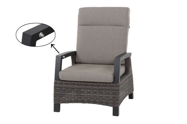 Gönnen Sie sich eine Auszeit. Mit dem hochwertigen Sessel holen Sie sich Ihren Wellness-Urlaub direkt nach Hause: Egal ob Sie die Sonne genießen, ein gutes Buch lesen oder einfach nur gemütlich mit Ihren Lieben gesellig beisammensitzen möchten. Dieser bequeme Sessel ist der ideale Begleiter und ein wahrer Anpassungskünstler, der Sie und Ihre Gäste jederzeit zum Verweilen einlädt. Die Rückenlehne lässt sich ganz einfach über einen Knopf in der Armlehne stufenlos einstellen. Die verbesserte Movetechnik sorgt für eine sanft laufende Rückenlehne, die müheloses Entspannen ermöglicht. Der Sessel hat ein Gesamtmaß von ca. 73 x 87 x 103 cm. Die ca. 60 cm breite Sitzfläche bietet genügend Platz. Mit einer großzügigen Sitztiefe von ca. 59 cm und bei einer Sitzhöhe von ca. 36 cm ohne Kissen lässt es sich hier auch herrlich bei einem Nickerchen entschleunigen. Die praktischen Armlehnen aus Aluminium bieten zusätzlichen Komfort und sind echte Hingucker. Passende, extra starke Kissen in der Trendfarbe taupe meliert verleihen dem Sitzmöbel ein unvergleichliches Sitzerlebnis.