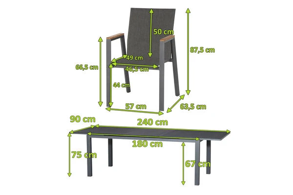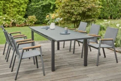 SIENA GARDEN Gomera II/Miros Esstischgarnitur, matt graphit/grau, Alu/Teak/Spraystone/Texfabric, Tisch 180/240×90 cm, 6 Stapelsessel