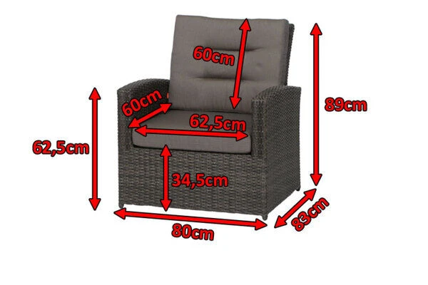 In diesem gemütliche Loungesessel können Sie gemütlich mit einem guten Buch in der Sonne liegen oder aber auch ganz bequem Ihr Mittag- oder Abendessen zu sich nehmen. Der Sessel hat ein Gesamtmaß von ca. 83 x 80 x 89 cm. Die Sitzfläche ist ca. 60 cm tief, die Sitzhöhe liegt bei ca. 34,5 cm. Die Armlehnen mit einer Höhe von ca. 62,5 cm sorgen bei diesem Sessel für besonderen Komfort.