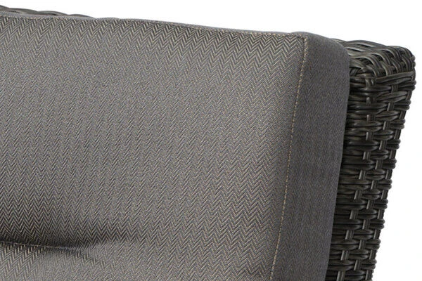 Das Untergestell des Möbelstücks besteht aus pulverbeschichtetem Aluminium, dies macht es nicht nur stabil, sondern sorgt auch dafür, dass es sich aufgrund des relativ geringen Gewichts (ca. 11,06 kg) ganz leicht hin und her stellen lässt. Das Aluminiumgestell wird mit doppelhalbrundem GARDINO®-Geflecht bespannt. Die Basis dieses Geflechts bildet der Kunststoff Polyethylen. Durch die geringe Feuchtigkeitsaufnahme dieser Faser trocknet sie besonders schnell und ist dadurch schmutzunempfindlich. Zudem zeichnet sie sich durch eine natürliche Optik aus und erzeugt eine edle und moderne Ausstrahlung. Der moderne Grauton der Faser passt perfekt zu den meisten Einrichtungsstilen und Gartengestaltungen. Gemütliche Sitz- und Rückenpolster und das gestreifte Dekokissen (100 % Polypropylen (280 g/m²)) sorgen für höchsten Sitzkomfort. Farblich sind die grauen Polster perfekt auf das Geflecht abgestimmt.
