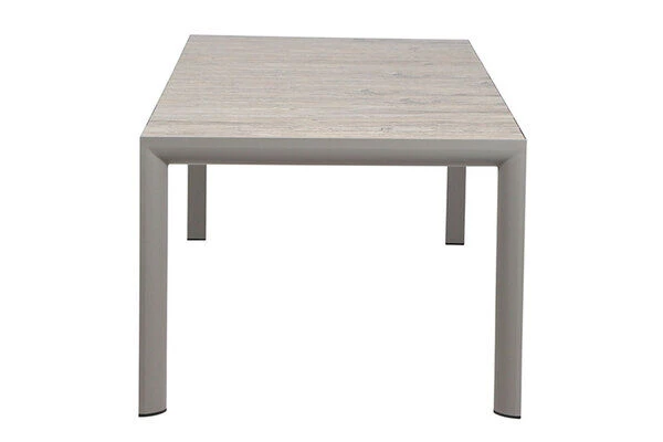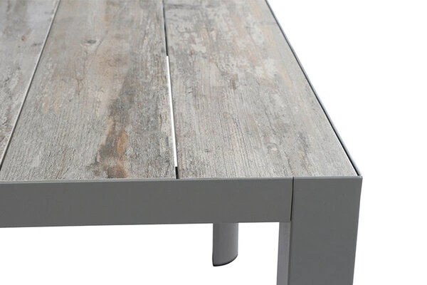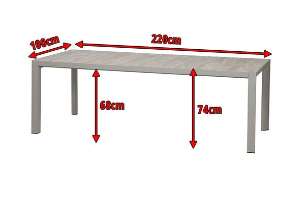 Wer das Besondere liebt ist mit diesem Esstisch bestens bedient. Der Tisch bietet mit seinen Maßen von ca. 220 x 100 x 74 cm Platz für 8-10 Personen – so steht dem gemütlichen Mittagessen mit der Familie nichts mehr im Wege. Das Gestell wurde aus pulverbeschichtetem Aluminium in matt silber hergestellt, was den Tisch besonders haltbar macht. Die Tischplatte besteht aus hochwertigem Keramik in Holzoptik in der Farbe washed grey, während die dreieckig geformten Tischbeine für ein weiteres optisches Highlight sorgen. Die Unterschubhöhe beträgt ca. 66,5 cm – so kann man gemütlich mit vielen Arten von Sesseln an diesem Tisch Platz nehmen. Der Tisch hat ein Gewicht von ca. 64 kg, und ist somit perfekt gegen Windstöße geschützt. Die Fußkappen bestehen aus schwarzem Kunststoff und schützen den Boden vor unschönen Kratzern beim Verrücken des Möbelstücks.