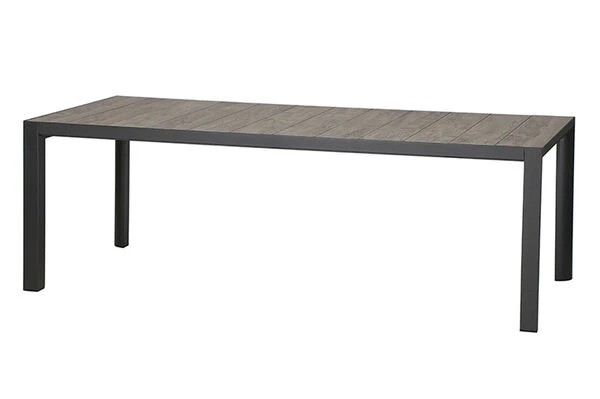 Wer das Besondere liebt ist mit diesem Esstisch bestens bedient. Der Tisch bietet mit seinen Maßen von ca. 220 x 100 x 74 cm Platz für 8-10 Personen – so steht dem gemütlichen Mittagessen mit der Familie nichts mehr im Wege. Das Gestell wurde aus pulverbeschichtetem Aluminium in matt anthrazit hergestellt, was den Tisch besonders haltbar macht. Die Tischplatte besteht aus hochwertigem Keramik in Holzoptik in der Farbe washed grey, während die dreieckig geformten Tischbeine für ein weiteres optisches Highlight sorgen. Die Unterschubhöhe beträgt ca. 68 cm – so kann man gemütlich mit vielen Arten von Sesseln an diesem Tisch Platz nehmen. Der Tisch hat ein Gewicht von ca. 64 kg, und ist somit perfekt gegen Windstöße geschützt. Die Fußkappen bestehen aus schwarzem Kunststoff und schützen den Boden vor unschönen Kratzern beim Verrücken des Möbelstücks.