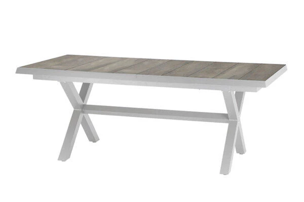 Wer in größeren Dimensionen denkt ist mit diesem Tisch bestens bedient. Der Tisch bietet mit seiner rechteckigen Form und Maßen von ca. 200 x 100 x 77 cm Platz für einen gemütlichen Nachmittag mit Ihrer Familie in der Sonne. Der Tisch lässt sich durch Ziehen an beiden Seiten und Hochklappen der integrierten, mittleren Tischplatte bis auf eine Länge von ca. 260 cm ausziehen – perfekt, wenn sich noch spontaner Besuch ankündigt oder Sie einen schönen Grillabend mit Freunden und Nachbarn planen. Das Gestell wurde aus pulverbeschichtetem Aluminium in matt weiß-grau hergestellt, was den Tisch besonders haltbar macht. Die Tischplatte in washed grey besteht aus hochwertigem Keramik und besitzt eine Stärke von ca. 10 mm. Die quadratisch geformten Tischbeine sorgen für ein weiteres optisches Highlight. Die Fußkappen bestehen aus weiß-grauem Kunststoff und schützen den Boden vor unschönen Kratzern beim Verrücken des Möbelstücks.