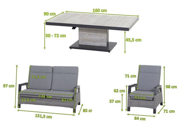 Der praktische Lifttisch Bellani ist ein wahres Multitalent, er ist ideal als Kaffee- und Esstisch einsetzbar. Er bietet mit Maßen von ca. 160 x 90 x 50/72 cm großzügig Platz für bis zu 6 Personen – so steht einem leckeren Brunch oder einem gemütlichen Kaffeekränzchen nichts im Wege. Durch einen Hebel unterhalb der Tischfläche können Sie den Tisch problemlos mittels eines Hydrauliksystems stufenlos höhenverstellen. Der Tischunterbau besteht aus Keramikplatten in pinie-grau. Das Gestell wurde aus pulverbeschichtetem Aluminium in matt anthrazit hergestellt. Die Tischplatte ebenfalls in pinie-grau ist aus Keramik und dadurch robust, pflegeleicht und dazu noch wetterfest – ideal für die Nutzung im Outdoor- und Innenbereich.