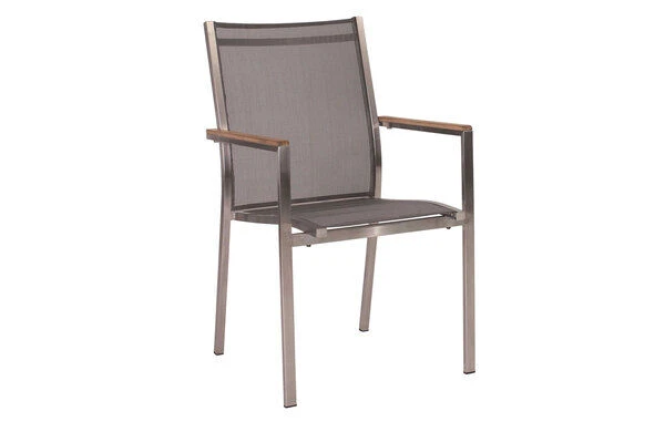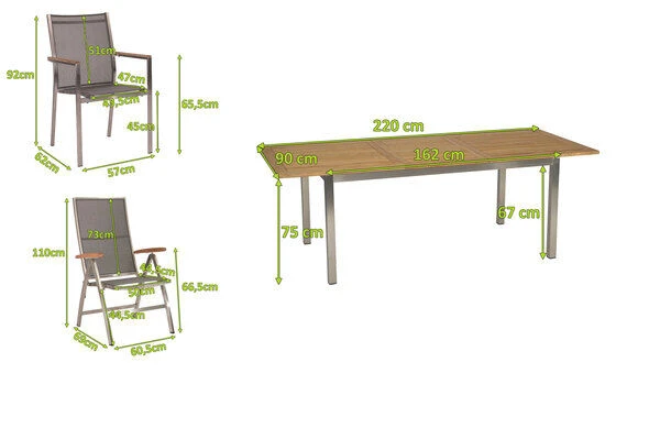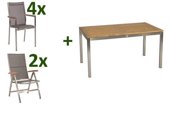 4x Stapelsessel Cardiff, silber/silbergrau, Edelstahl/Textilene/FSC-Teakholz, ca. 62x57x92 cm (417475) 2x Multipositionssessel Cardiff, silber/silbergrau, Edelstahl/Textilene/FSC-Teakholz, ca. 69×60,5×110 cm (417476) 1x STERN Ausziehtisch, silber/natur, Edelstahl/FSC-Teakholz, ca. 162/220x90x75 cm, Butterfly-Auszug (417379)