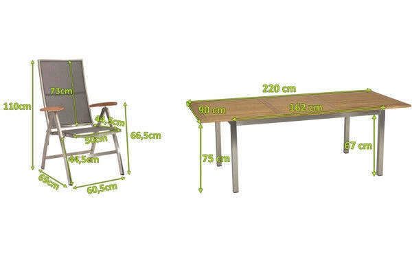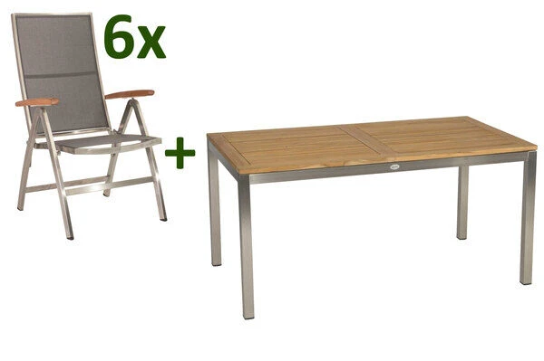 6x Multipositionssessel Cardiff, silber/silbergrau, Edelstahl/Textilene/FSC-Teakholz, ca. 69×60,5×110 cm (417476) 1x STERN Ausziehtisch, silber/natur, Edelstahl/FSC-Teakholz, ca. 162/220x90x75 cm, Butterfly-Auszug (417379)