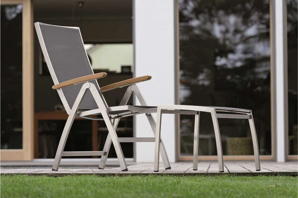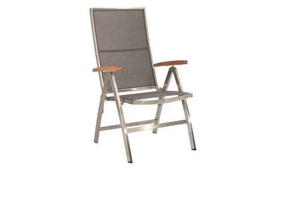 Der Sessel überzeugt nicht nur mit seinem zeitlosen Design und den hochwertigen Materialien, sondern vor allem auch durch seinen Komfort und seine Funktionalität. Schlicht, unauffällig und dennoch ein Hingucker. So lässt sich der Cardiff wohl am besten beschreiben. Holen Sie sich mit diesem Sessel Eleganz vereint mit perfektem Sitzkomfort nach Hause und genießen Sie entspannte Stunden z.B. nach Ihrem Feierabend. Die hochwertigen Materialien und die sorgfältige Verarbeitung sorgen nicht nur für die besondere Optik dieses Stuhls, sondern machen ihn mit einer Belastbarkeit von ca. 120 kg zudem sehr stabil. Der Cardiff wird Ihnen durch seine hohe Widerstandsfähigkeit gegen Wind und Wetter viele Jahre Freude bereiten. Das verwendete Edelstahl der Güteklasse 304 ist rostfrei und ebenso wie das Textilgewebe der Sitzfläche und Rückenlehne in silbergrau besonders pflegeleicht. Leichte Verschmutzungen lassen sich ganz einfach mit ein wenig Wasser wieder entfernen. Das für die Armlehnen verwendete Teakholz ist FSC-zertifiziert und stammt damit aus verantwortungsvollen Quellen. So können Sie sich guten Gewissens zurücklehnen und sich so richtig entspannen. Durch seine Klappfunktion und den Maßen von ca. 69 x 60,5 x 110 cm lässt sich der Stuhl aber dennoch platzsparend verstauen, wenn Sie doch einmal etwas mehr Platz auf Ihrer Terrasse oder im Garten benötigen sollten.