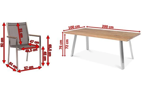 Die Kombination aus edlen, zeitlosen und rustikal, gemütlichen Elementen macht diese Esstischgruppe so besonders. Das Set besteht aus einem Esstisch der Marke OUTFLEXX mit den Maßen von ca. 200 x 100 x 76 cm und 6 Stapelsesseln der Marke Stern aus der Serie „Cardiff“. Die hellen Farben des Gestells sind in Verbindung mit der Farbe des Teakholzes ein echter Hingucker und sorgen für eine zeitlose Frische. Dadurch lässt sich die Esstischgruppe wunderbar mit anderen Farben kombinieren. So bleibt Ihnen viel Raum für kreative Gestaltungsmöglichkeiten. Die hochwertigen Materialien und die sorgfältige Verarbeitung sorgen nicht nur für die besondere Optik dieser Esstischgruppe, sondern machen sie auch sehr stabil.