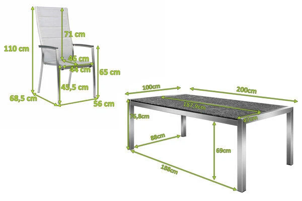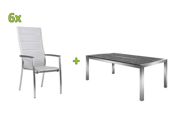 Hier fühlt sich jeder Gast sofort willkommen! Verwandeln Sie mit dieser tollen Tischgruppe Ihre Terrasse in einen charmanten Wohnbereich im heimischen Garten. Sie erhalten einen ausdrucksstarken Esstisch aus Edelstahl und Granit und 6 dazu passende Stapelsessel der Serie Cardiff von STERN, die für einen gehobenen Sitzgenuss sorgen. Gönnen Sie sich Ihren persönlichen Essplatz im Freien.