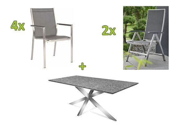 STERN Esstischgarnitur, silbergrau/grau, OUTFLEXX Esstisch in silber/perlgrau matt, 4 Stapelsessel, 2 Multipositionssessel