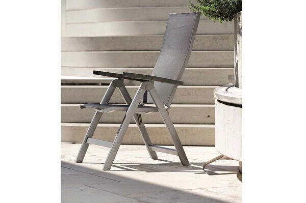 Der Sessel überzeugt nicht nur mit seinem zeitlosen Design und den hochwertigen Materialien, sondern vor allem auch durch seinen Komfort und seine Funktionalität. Schlicht, unauffällig und dennoch ein Hingucker. So lässt sich der New Top wohl am besten beschreiben. Holen Sie sich mit diesem Sessel Eleganz vereint mit perfektem Sitzkomfort nach Hause und genießen Sie entspannte Stunden z.B. nach Ihrem Feierabend. Die hochwertigen Materialien und die sorgfältige Verarbeitung sorgen nicht nur für die besondere Optik dieses Stuhls, sondern machen ihn auch äußerst stabil. Der New Top wird Ihnen durch seine hohe Widerstandsfähigkeit gegen Wind und Wetter viele Jahre Freude bereiten. Das Gestell aus Aluminium ebenso wie das Textilgewebe der Sitzfläche und der Rückenlehne sind besonders pflegeleicht. Die Sitzfläche hat die Farbe silbergrau. Leichte Verschmutzungen lassen sich ganz einfach mit ein wenig Wasser wieder entfernen. Durch seine Klappfunktion und den Maßen von ca. 75 x 60 x 113 cm lässt sich der Stuhl platzsparend verstauen, wenn Sie doch einmal etwas mehr Platz auf Ihrer Terrasse oder im Garten benötigen sollten. Der Klappsessel bietet 5 verschiedene Verstellmöglichkeiten, sodass Sie immer die ideale Sitz/-Liegeposition erreichen.