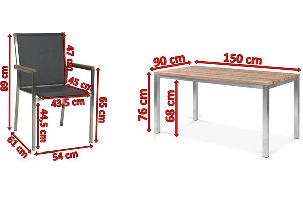 Wenn Sie sich jetzt angesprochen fühlen, sollten Sie sich diese Esstischgarnitur genauer anschauen. Das Set besteht aus einem Esstisch aus dem Hause Outflexx mit den Maßen von ca. 150 x 90 x 76 cm und 4 Stapelsesseln aus der „Polaris“-Serie von Stern mit FSC-Teakholz Armlehnen.