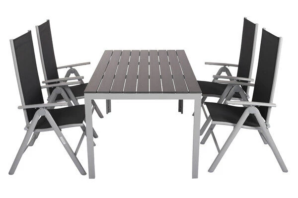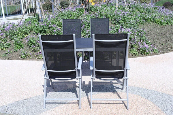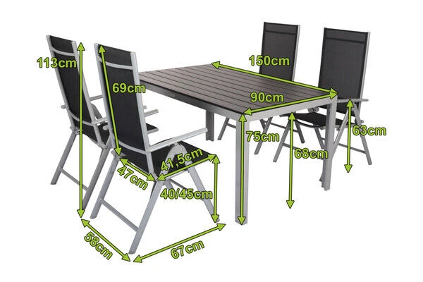 Diese Esstischgarnitur besteht aus 4 bequemen Sesseln und einem Gartentisch – perfekt, für eine kleine Runde aus Freunden, Familie oder Nachbarn. Bei Bedarf können Sie diese Gruppe mit passenden Artikeln der VILLANA Serie erweitern. Der optisch zeitlose Esstisch hat Maße von ca. 150 x 90 x 75 cm und besitzt ein Gestell aus pulverbeschichtetem Aluminium in der Farbe Silber. Aluminium ist ein gern verwendetes Material im Gartenmöbelsektor, da es besonders leicht, zeitgleich jedoch sehr stabil ist. Dazu kommt der geringe Pflegeaufwand durch die Pulverbeschichtung. Die meisten Verschmutzungen lassen sich unkompliziert mit Wasser aufweichen und anschließend abspülen oder mit einem weichen Schwamm entfernen. Das gewisse Etwas erhält der Esstisch durch seine Tischplatte in der Farbe Schwarz. Das Holzimitat schafft Ihnen die Optik von Holz, hat aber den geringen Pflegeaufwand von Kunststoff und ist zudem wetterfest. Die ca. 2 cm dicke Tischplatte bildet ein zuverlässiges Element des Tisches. Die geschickte Kombination von modernen Materialien ermöglicht ein geringes Gewicht von gerade einmal ca. 18,7 kg mit einer maximale Belastbarkeit von ca. 50 kg. Mit der Tischunterkante in Höhe von ca. 68 cm lassen sich die Stühle problemlos unter die Tischplatte schieben.