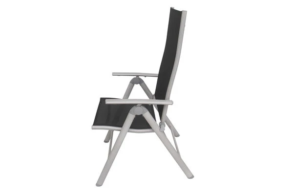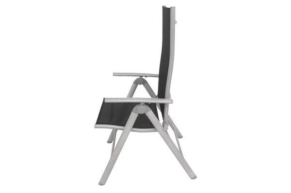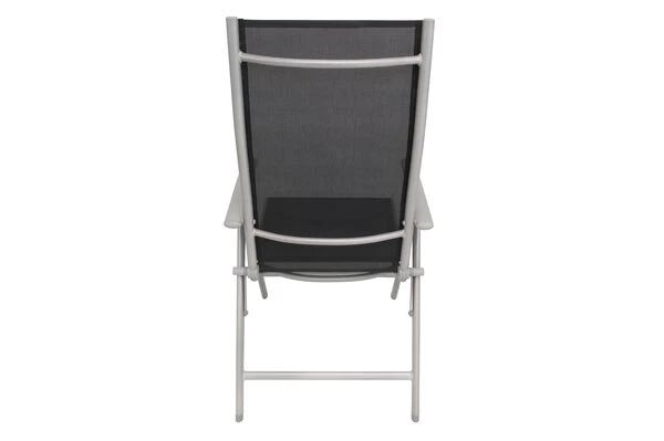 Die im Set enthaltenen Multipositionssessel sind nicht nur modern, sondern auch praktisch! Die Stühle mit Maßen von jeweils ca. 67 x 58 x 113 cm lassen sich bei Nichtgebrauch einfach zusammenklappen und platzsparend verstauen. Auch die Sessel haben ein Gestell aus pulverbeschichtetem Aluminium in der Farbe Silber. Dazu ist das Leichtgewicht mit ca. 4,3 kg besonders stabil und beeindruckt mit einer maximalen Belastbarkeit von ca. 160 kg. Dabei kommt der Komfort nicht zu kurz! Die geteilte Sitz- und Rückenfläche ist mit dem modernen Material Textilene (70% Polyvinylchlorid, 30% Polyester) in der Farbe Schwarz bespannt. Das Kunststoffgewebe zeichnet sich vor allem durch seine hohe Belastbarkeit und seinen hohen Komfort aus. Zudem ist es frost- und hitzebeständig, was zusammen mit der hohen Lichtbeständigkeit für eine lange Attraktivität Ihrer Sitzmöbel sorgt. Auch nimmt Textilene kaum Feuchtigkeit auf, so dass die Sitzfläche nach einem Regenschauer schnell wieder trocken ist. Mit einer Sitzbreite von ca. 47 cm und einer Sitztiefe von ca. 41,5 cm wollen Sie aus diesem Stuhl gar nicht mehr aufstehen! Für das Plus an Komfort bietet Ihnen der Multipositionssessel eine 8-fach verstellbare Rückenlehne – lehnen Sie sich zurück und lassen Sie die Alltagssorgen hinter sich. Zusätzliche Fußkappen in der Farbe Silber vermeiden unschöne Kratzer auf Ihrer Terrasse und bieten zugleich Schutz für Ihre Möbel.