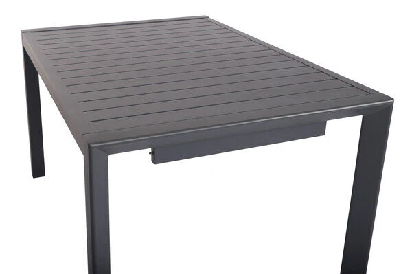Diese Esstischgarnitur besteht aus 4 bequemen Sesseln und einem Ausziehtisch – perfekt, für eine kleine Runde aus Freunden, Familie oder Nachbarn. Bei Bedarf können Sie diese Gruppe mit passenden Artikeln der VILLANA Serie erweitern. Der optisch zeitlose Esstisch ist rein aus Aluminium gefertigt und besitzt eine Pulverbeschichtung in der Farbe Anthrazit. Aluminium ist ein gern verwendetes Material im Gartenmöbelsektor, da es besonders leicht, zeitgleich jedoch sehr stabil ist. Dazu kommt der geringe Pflegeaufwand durch die Pulverbeschichtung. Die meisten Verschmutzungen lassen sich unkompliziert mit Wasser aufweichen und anschließend abspülen oder mit einem weichen Schwamm entfernen. Zusammengefahren hat der Tisch bereits eine Größe von ca. 130 x 90 x 72 cm. Dabei hat der Tisch stets eine Unterkantenhöhe von ca. 68 cm – so können Sie die Stühle problemlos unter die Tischplatte schieben. Um die volle Größe des Tisches zu erhalten, ziehen Sie den Tisch einfach an der Auszugsseite aus. Unter der oberen Tischplatte kommt die Einlage zur Verlängerung der Tischplatte zum Vorschein. Diese müssen Sie manuell herausnehmen und auf das Gestell der Tischplatte legen. Letzlich werden durch das Zusammenschieben von Tischgestell und Einlegeplatte die Pins in die dafür vorgesehenen Löcher geschoben und es entsteht ein insgesamt größerer Tisch. Der ausgezogene Tisch weist nun eine Gesamtlänge von ca. 180 cm auf. Den Mechanismus finden Sie auch in der Bildergalerie des Sets. Der Clou: Im Gegensatz zu anderen Ausziehtischen haben Sie hier keine freischwebende Tischplatte, sondern die Tischplatte liegt bündig auf dem Untergestell auf. Die ca. 2 cm dicke Tischplatte bildet ein zuverlässiges Element des Tisches. Durch die geschickte Verarbeitung besitzt das Gestell eine besonders hohe Stabilität und dank des Gewichtes von ca. 22,7 kg ist der Tisch bis ca. 50 kg belastbar. Mit der Tischunterkante in Höhe von ca. 64,5 cm lassen sich die Stühle problemlos unter die Tischplatte schieben.