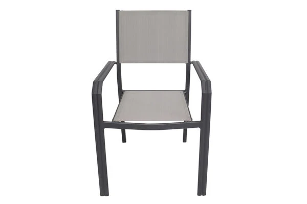 Die im Set enthaltenen Sessel sind nicht nur elegant, sondern auch praktisch! Die Stühle mit Maßen von jeweils ca. 58 x 57 x 90 cm lassen sich bei Nichtgebrauch einfach stapeln und platzsparend verstauen. Auch die Sessel haben ein Gestell aus pulverbeschichtetem Aluminium in der Farbe Anthrazit. Dazu ist das Leichtgewicht mit ca. 2,9 kg besonders stabil und beeindruckt mit einer maximalen Belastbarkeit von ca. 160 kg. Dabei kommt der Komfort nicht zu kurz! Die geteilte Sitz- und Rückenfläche ist mit dem modernen Material Textilene (70% Polyvinylchlorid, 30% Polyester) in der Farbe Grau bespannt. Das Kunststoffgewebe zeichnet sich vor allem durch seine hohe Belastbarkeit und seinen hohen Komfort aus. Zudem ist es frost- und hitzebeständig, was zusammen mit der hohen Lichtbeständigkeit für eine lange Attraktivität Ihrer Sitzmöbel sorgt. Auch nimmt Textilene kaum Feuchtigkeit auf, so dass die Sitzfläche nach einem Regenschauer schnell wieder trocken ist. Mit einer Sitzhöhe von ca. 42 cm und einer Sitztiefe von ca. 46 cm wollen Sie aus diesem Stuhl gar nicht mehr aufstehen! Zusätzliche Fußkappen vermeiden unschöne Kratzer auf Ihrer Terrasse und bieten zugleich Schutz für Ihre Möbel.