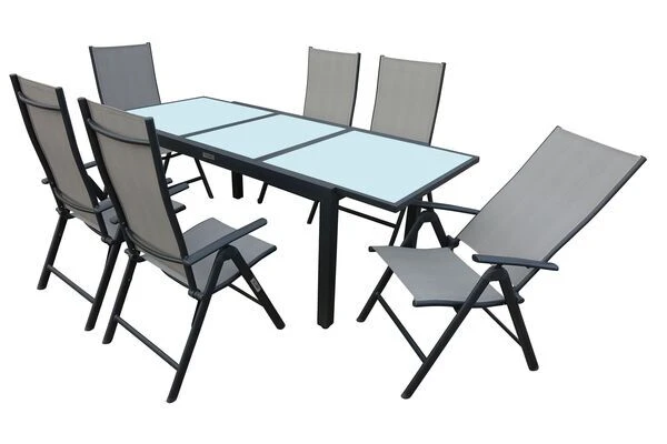 Diese Villana Esstischgruppe bietet Platz für sechs Personen – perfekt, um mit Freunden, Familie oder Nachbarn gemütlich im Garten oder auf der Terrasse zu sitzen. Die Gruppe setzt sich aus einem ausziehbaren Gartentisch und sechs Multipositionssesseln zusammen, auf Wunsch können Sie diese Gruppe auch noch mit passenden Artikeln der Villana Serie erweitern. Der Tisch ist ca. 90 cm breit und ca. 75 cm hoch, im normalen Zustand hat er eine Länge von ca. 160 cm, so sind Sie sowohl für ein gemütliches Mittagessen mit der Familie als auch für die große Gartenparty bestens ausgerüstet. Das pulverbeschichtete Aluminiumgestell des Tisches kommt in einem attraktiven Anthrazit daher, die ca. 5 mm dicke Tischplatte aus Sicherheitsglas ist weiß. Die Platte zum Erweitern des Tisches ist ebenfalls aus ca. 5 mm dickem Sicherheitsglas gefertigt und lässt sich durch einen Flügelmechanismus ausklappen. Man zieht einfach die beiden oberen Platten auseinander und klappt die darunterliegende Platte nach oben, und schon ist der Tisch auf ca. 220 cm erweitert. Der Sessel verfügt ebenfalls über ein anthrazitfarben pulverbeschichtetes Aluminiumgestell, auf welches ein formstabiles Textil-Gewebe 2×1 (70% Polyvinylchlorid / 30% Polyester) in Grau aufgespannt wurde. Mit Maßen von ca. 67 x 58 x 113 cm und einem Gewicht von nur ca. 4,3 kg lässt sich der Stuhl ganz leicht hin und her stellen. Gleichzeitig bietet er die nötige Stabilität und einen angenehmen Sitzkomfort, denn dieser Sessel ist wirklich ein Verwandlungskünstler. Er bietet seinem Nutzer neun verschiedene Einstellungen der Rückenlehne. So ist für jede Situation die richtige Liege- oder Sitzeinstellung dabei – ob beim Essen mit Freunden oder Familie, beim Lesen eines Buches oder beim Sonnenbaden. Bei Nichtgebrauch lassen sich die Stühle ganz leicht zusammenklappen und nehmen so sehr wenig Platz ein. Mit einer Belastbarkeit von bis zu ca. 160 kg ist der praktische Sessel besonders robust und für erholsame Stunden in der Sonne einsatzbereit. Die Fußkappen der Möbel sind aus schwarzem Kunststoff und schützen den Boden vor unschönen Kratzern beim Verrücken des Stuhles, die silbernen Schrauben aus galvanisiertem Stahl runden die Optik perfekt ab.