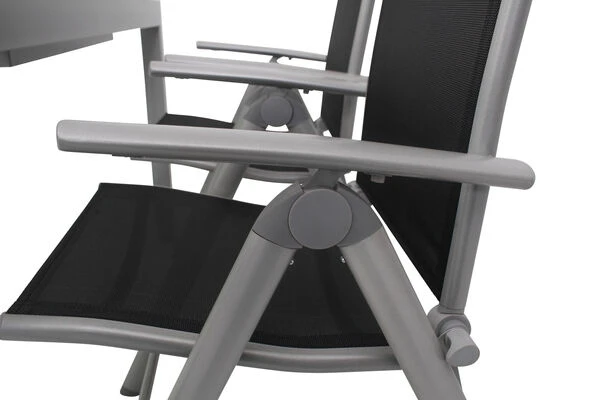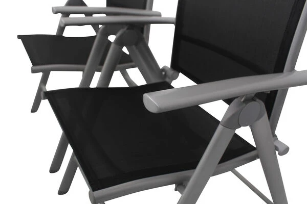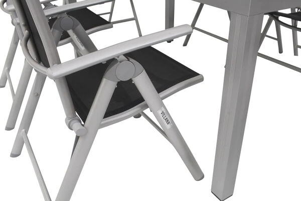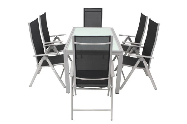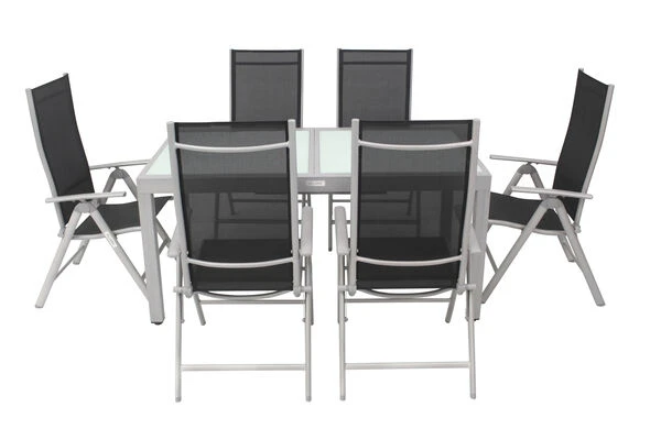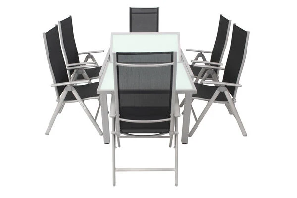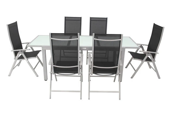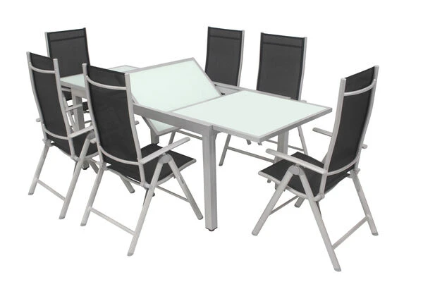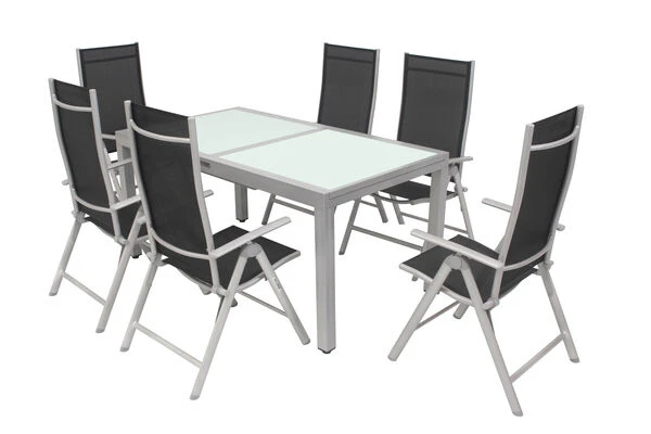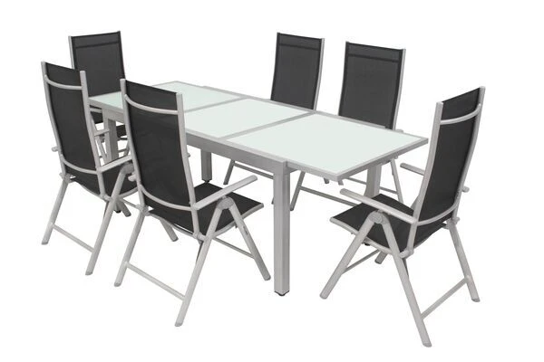 Diese Villana Esstischgruppe bietet Platz für sechs Personen – perfekt, um mit Freunden, Familie oder Nachbarn gemütlich im Garten oder auf der Terrasse zu sitzen. Die Gruppe setzt sich aus einem ausziehbaren Gartentisch und sechs Multipositionssesseln zusammen, auf Wunsch können Sie diese Gruppe auch noch mit passenden Artikeln der Villana Serie erweitern. Der Tisch ist ca. 90 cm breit und ca. 75 cm hoch, im normalen Zustand hat er eine Länge von ca. 160 cm, so sind Sie sowohl für ein gemütliches Mittagessen mit der Familie als auch für die große Gartenparty bestens ausgerüstet. Das pulverbeschichtete Aluminiumgestell des Tisches kommt in einem attraktiven Silber daher, die ca. 5 mm dicke Tischplatte aus Sicherheitsglas ist weiß. Die Platte zum Erweitern des Tisches ist ebenfalls aus ca. 5 mm dickem Sicherheitsglas gefertigt und lässt sich durch einen Flügelmechanismus ausklappen. Man zieht einfach die beiden oberen Platten auseinander und klappt die darunterliegende Platte nach oben, und schon ist der Tisch auf ca. 220 cm erweitert. Der Sessel verfügt ebenfalls über ein silberfarben pulverbeschichtetes Aluminiumgestell, auf welches ein formstabiles Textil-Gewebe 2×1 (70% Polyvinylchlorid / 30% Polyester) in Schwarz aufgespannt wurde. Mit Maßen von ca. 67 x 58 x 113 cm und einem Gewicht von nur ca. 4,3 kg lässt sich der Stuhl ganz leicht hin und her stellen. Gleichzeitig bietet er die nötige Stabilität und einen angenehmen Sitzkomfort, denn dieser Sessel ist wirklich ein Verwandlungskünstler. Er bietet seinem Nutzer neun verschiedene Einstellungen der Rückenlehne. So ist für jede Situation die richtige Liege- oder Sitzeinstellung dabei – ob beim Essen mit Freunden oder Familie, beim Lesen eines Buches oder beim Sonnenbaden. Bei Nichtgebrauch lassen sich die Stühle ganz leicht zusammenklappen und nehmen so sehr wenig Platz ein. Mit einer Belastbarkeit von bis zu ca. 160 kg ist der praktische Sessel besonders robust und für erholsame Stunden in der Sonne einsatzbereit. Die Fußkappen der Möbel sind aus silbernem Kunststoff und schützen den Boden vor unschönen Kratzern beim Verrücken des Stuhles, die silbernen Schrauben aus galvanisiertem Stahl runden die Optik perfekt ab.